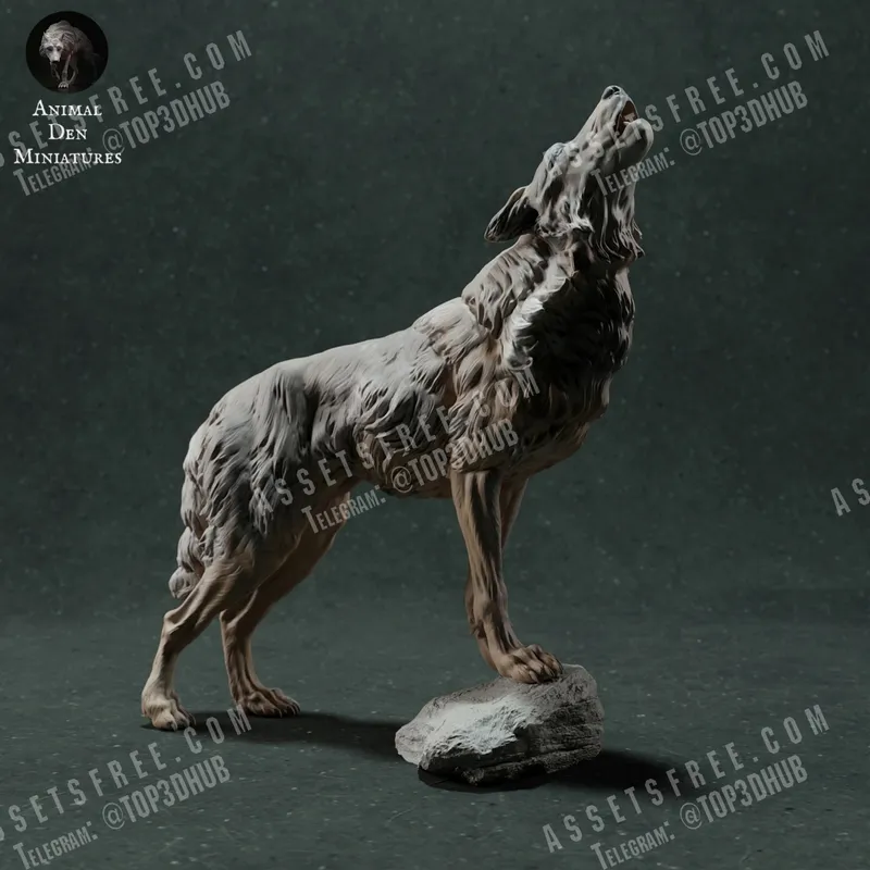 The overall form conveys the Iberian wolf in an upright posture, with the head tilted back to suggest a howling stance. The structure indicates a well-defined musculature, particularly in the limbs and torso, reflecting the animal’s adaptation to its environment. Arranged to suggest a sense of balance, the positioning of the legs ensures stability, characteristic of natural wolf behavior. The composition emphasizes the elongated snout and pointed ears, features typical of the species, which aid in vocalizations. This fan-made artistic interpretation offers detailed anatomical representation while adhering to biological accuracy.