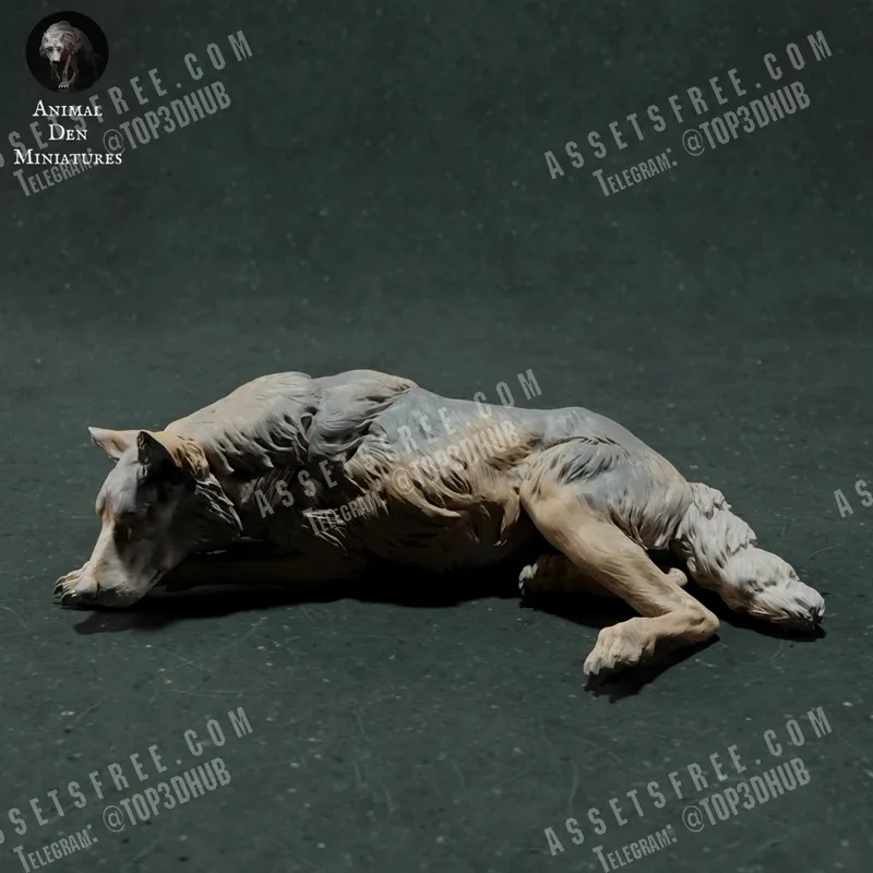 The overall form conveys the anatomical characteristics of an Iberian wolf in a relaxed state, emphasizing the natural contour of its body. The posture reflects a sleeping position, with limbs arranged to suggest a balanced distribution of weight. The structure indicates a streamlined physique, appropriate for a predator, while the positioning of the head and ears suggests an alert yet restful state. The composition emphasizes the harmony of the creature’s form with its ecological adaptations, illustrating the typical traits of the species in a moment of repose. This 3D printable model serves as a fan-made interpretation of the Iberian wolf’s anatomical elegance.